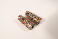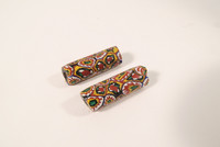 2 alte Millefiori Glasperlen, Venedig ca. 1880-1930, Seltener Typ. Perlengröße bis ca. 33 x 11mm. Altersgemäßer Zustand, bestoßen mit Chips, siehe Fotos.
