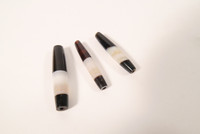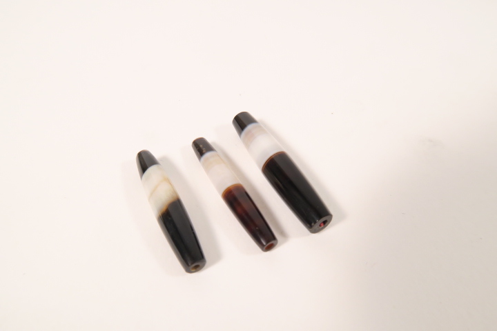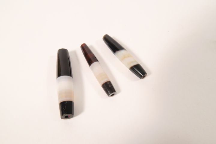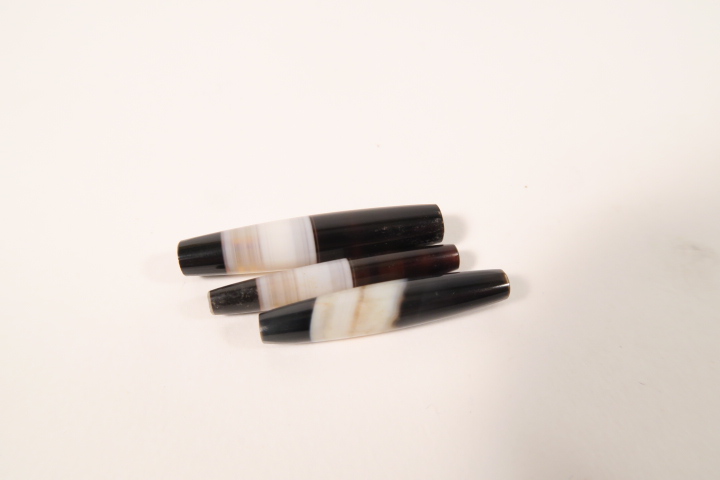 3 Achatperlen, welche von Idar-Oberstein nach Afrika und Asien gehandelt wurden. Diese Perlen hatten in Teilen Afrikas Geldcharakter. Kürzlich in Idar-Oberstein gefundener Altbestand.