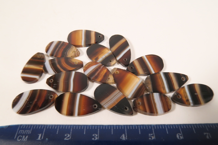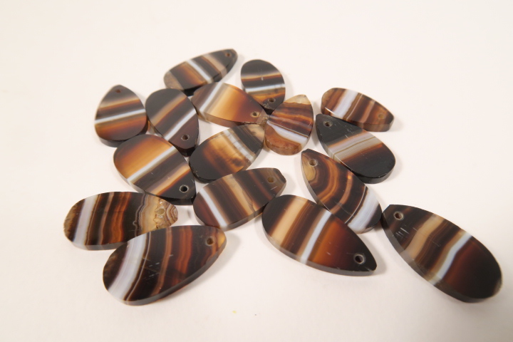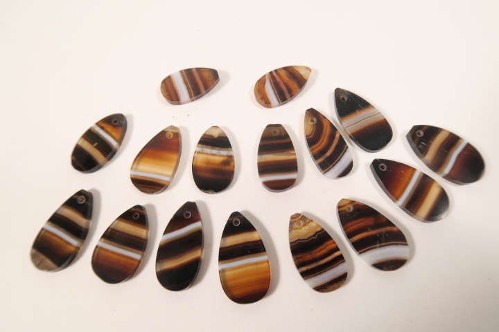 16 Achatanhänger, welche von Idar-Oberstein nach Afrika und Asien gehandelt wurden. Diese Perlen hatten in Teilen Afrikas Geldcharakter. Kürzlich in Idar-Oberstein gefundener Altbestand. Teils bestoßen, Zustand siehe Fotos.