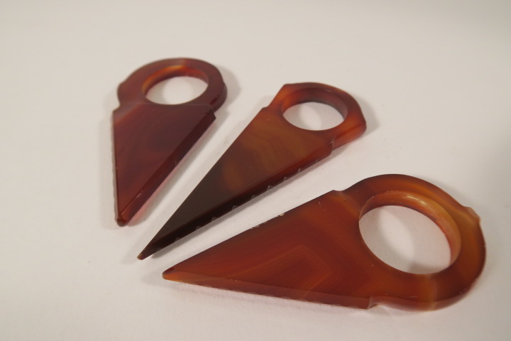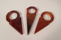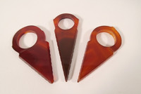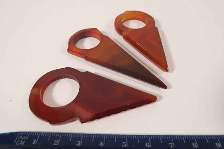 3 Achatanhänger, welche von Idar-Oberstein nach Afrika gehandelt wurden. Diese Anhänger hatten in Teilen Afrikas Geldcharakter. Kürzlich in Idar-Oberstein gefundener Altbestand.