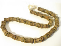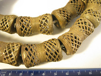 Fein gearbeitete Metallperlen, altes traditionelles Handwerk der Ashanti aus Ghana. Hergestellt im Wachsausschmelzverfahren. Kleinere Gußfehler sind teils vorhanden. Größe der Perlen ca. 32mm (Länge) x 20mm (Maximaler Durchmesser) 23 Stück Perlen pro Strang. Ideal zum Schmuckdesign. Recht große Löcher zum Fädeln. Preis je Strang, jedoch bei Abnahme von verschiedenen Varinaten von Messingperlen im Wert von mindestens € 30,00 ist eine geringere Abnahmemenge möglich. Gesamtgewicht ca. 357gr.