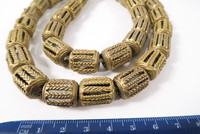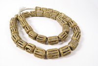 Fein gearbeitete Metallperlen, altes traditionelles Handwerk der Akan aus Ghana / Elfenbeinküste. Hergestellt im Wachsausschmelzverfahren. Kleinere Gußfehler sind teils vorhanden. Größe der Perlen ca. 16mm x 13mm. Ideal zum Schmuckdesign. Recht große Löcher zum Fädeln. Stranglänge ca. 56cm. Gewicht ca. 150gr.