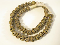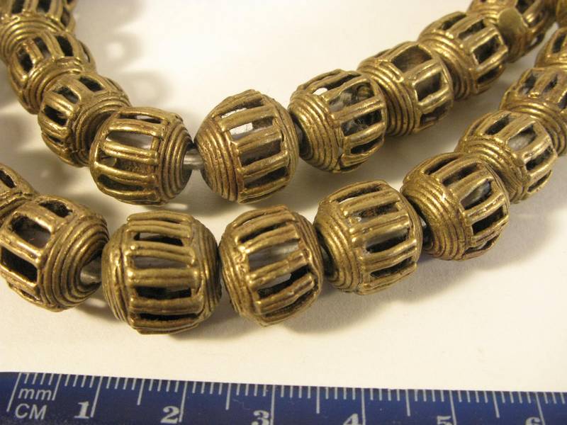 Fein gearbeitete Metallperlen, altes traditionelles Handwerk der Ashanti aus Ghana. Hergestellt im Wachsausschmelzverfahren. Kleinere Gußfehler sind teils vorhanden. Stranglänge nur Perlen ca. 54cm. Maximaler Durchmesser der Perlen 13 - 14mm. 44 Stück Perlen pro Strang. Ideal zum Schmuckdesign. Recht große Löcher zum Fädeln. Preis je Strang. Gesamtgewicht ca. 123gr.