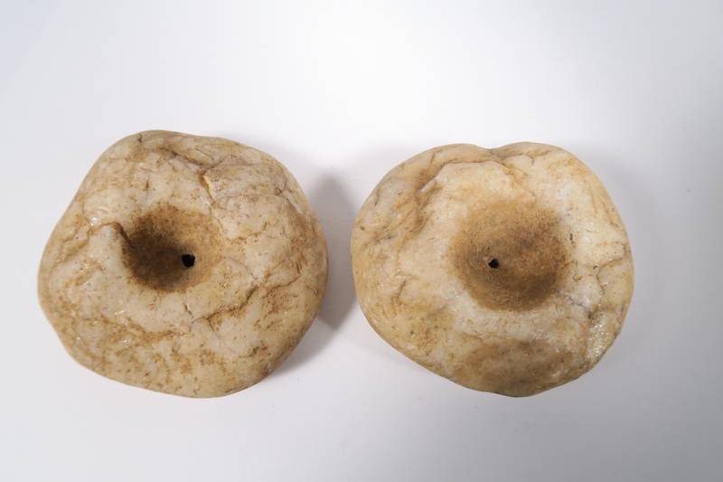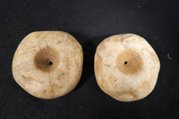 2 sehr große scheibenförmige Quarzperlen aus dem Sahel. Die Perlen sind 2seitig gebohrt und in ungereinigtem Zustand. Maximaler durchmesser ca. 72mm. Gesamtgewicht ca. 415gr.