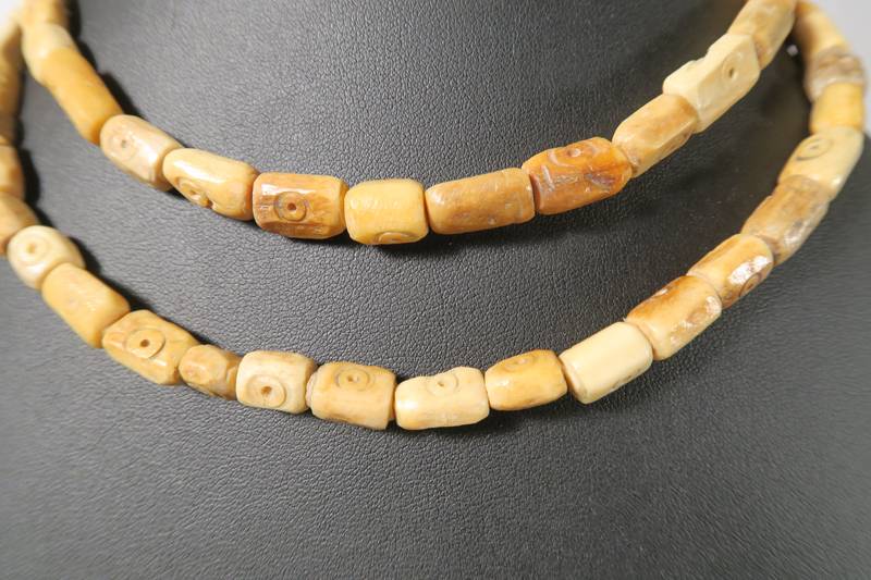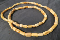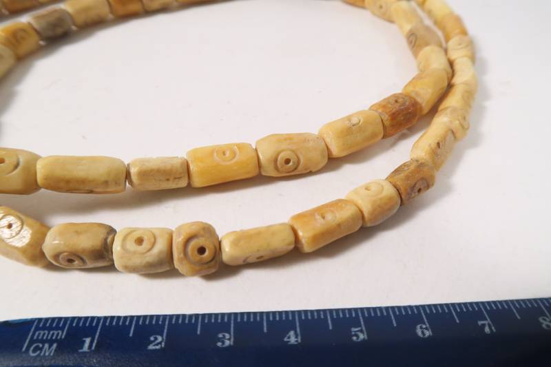 Strang alter Knochenperlen aus Nigeria. Rinderknochen, vermutlich vor 1980 produziert. Länge nur Perlen ca. 84cm. Durchmesser der Perlen ca. 6 - 9mm. Gewicht ca. 70gr.
