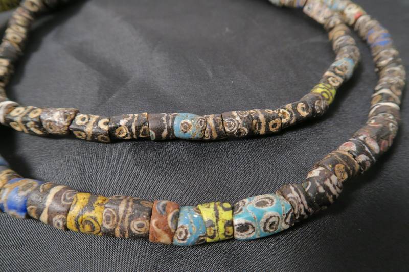 Schöner Strang alter Glasperlen aus Ghana. Die Perlen wurden von den Krobo gefertigt und sind in zumeist gutem Zustand. Einige der Glasperlen sind alten venezianischen und islamischen Augenperlen nachempfunden. Vermutlich vor 1950 produziert. Länge nur Perlen ca. 92cm. Durchmesser der Perlen ca. 7 - 10mm. Gewicht ca. 135gr.