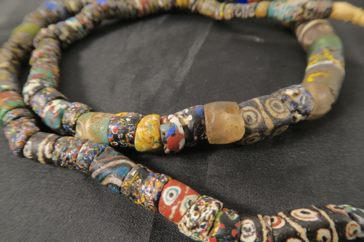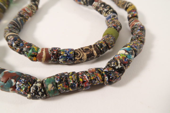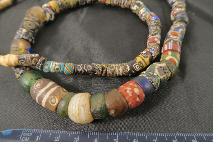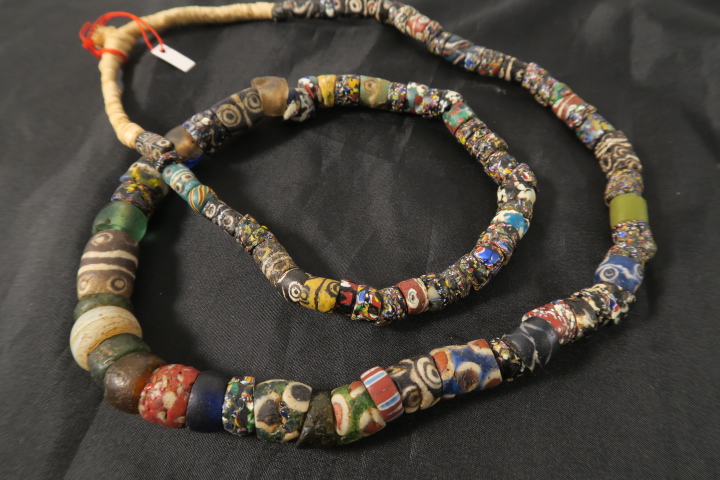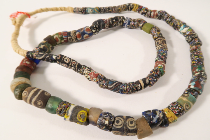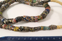 Strang alter Glasperlen aus Ghana. Die Perlen wurden von den Krobo gefertigt und sind in zumeist gutem Zustand. Vermutlich vor 1960 produziert. Länge nur Perlen ca. 68cm. Durchmesser der Perlen ca. 7 - 14mm. Gewicht ca. 145gr.