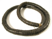 Strang alter scheibenförmiger Perlen aus Kokosholz gefertigt. Die Perlen sind in zumeist gutem Zustand mit schöner Patina. Um 1920 produziert und früher zumeist als Hüftschmuck getragen. Länge (Umfang des Stranges) ca. 92cm. Durchmesser der Perlen ca. 13 - 22mm. Gewicht ca. 335gr.