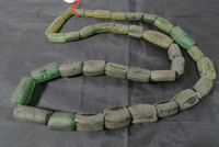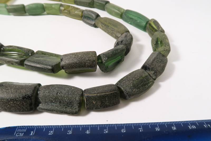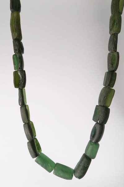 Strang von alten Glasperlen, zumeist aus alten Flaschen und Flaschenböden hergestellt. Sehr reizvolle transparente Perlen mit unterschiedlichen Grüntönen in zumeist gutem altersgemäßem Zustand, teils mit Chips. Stranglänge nur Perlen ca. 92cm. Durchmesser der Perlen ca. 7 - 18mm. Gewicht ca. 300gr.