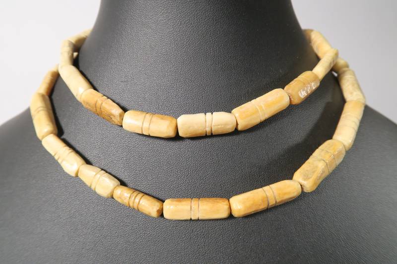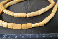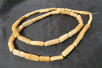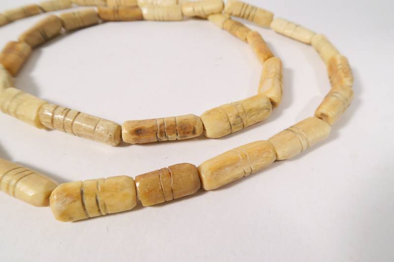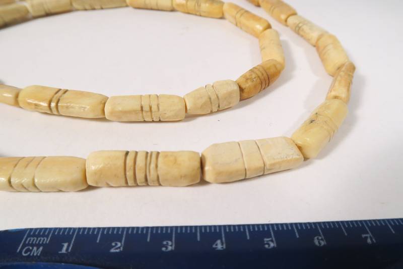 Strang alter Knochenperlen aus Nigeria. Rinderknochen, vermutlich vor 1980 produziert. Länge nur Perlen ca. 80cm. Durchmesser der Perlen ca. 5 - 9mm. Gewicht ca. 65gr.