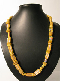 Schöner Strang von alten venezianischen Handelsperlen und älteren Spacern, ghanaischen Ursprungs. Der Strang wurde so getragen. Die Endperle ist leider gebrochen, siehe Fotos. Stranglänge (Umfang) ca. 64cm. Durchmesser der 15 flachen venezianischen Perlen ca. 13mm. Gewicht ca. 154gr.