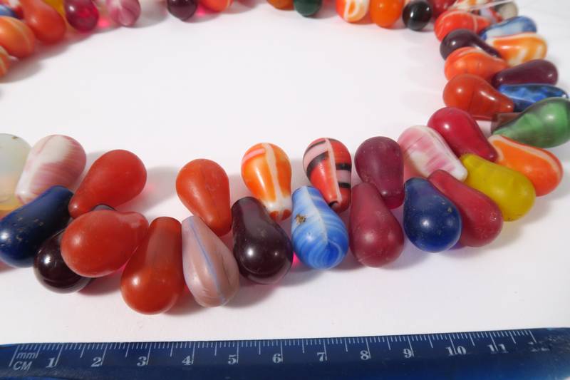 Strang alter, tropfenförmiger Handelsperlen, von Böhmen (Gablonz, Jablonec) um 1920 - 1960 nach Westafrika gehandelt. Sehr beliebt bei den Fulani. Schöne Farbtöne. Altersgemäßer Zustand, teils bestoßen mit Chips. Stranglänge (Tropfen) ca. 58cm. Länge der Tropfen ca. 24 - 25mm. Gewicht ca. 515gr. Geringe Farbabweichungen bedingt durch digitale Wiedergabe ist möglich.