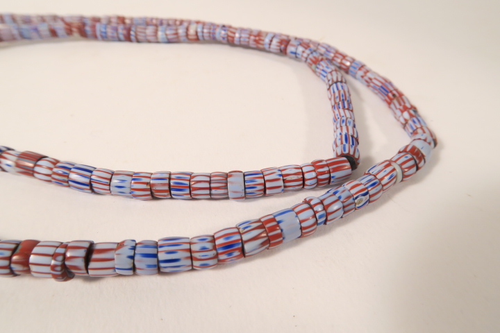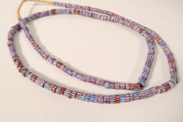 Schöner Strang alter Handelsperlen, Awale Chevron genannt, von Venedig um 1880-1930 nach Westafrika gehandelt. Diese Glasperlen wurden nicht nur nach Afrika gehandelt sondern auch nach Amerika an die Hudson Bay. Stranglänge nur Perlen ca. 77cm. Durchmesser der Perlen ca. 6mm. Gewicht ca. 52gr.