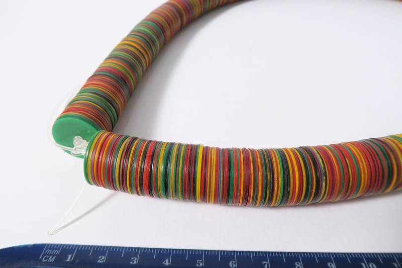 Strang von scheibenförmigen Kunststoffperlen, oft als Bakelit oder Vulcanic Beads bezeichnet. Zwischen 1920-1950 in Europa produziert und nach Afrika gehandelt. Diese Perlen wurden früher zumeist als Hüftschmuck von Frauen getragen. Dieser Strang wurde in Afrika neu aufgezogen. Die Perlen sind nicht nur bunt gemischt, sondern haben auch einen leicht unterschiedlichen Durchmesser, siehe Fotos. Stranglänge (Umfang) ca. 68cm. Durchmesser der Scheiben ca. 20mm. Gewicht ca. 290gr.