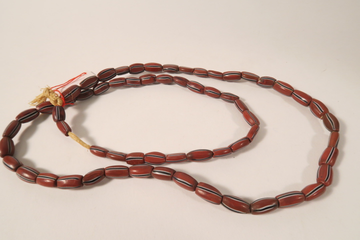Strang alter Glasperlen vermutlich von Murano um 1880-1930 nach Westafrika gehandelt. Glasperlen in zumeist gutem Zustand, teils gebrochen, teils bestoßen mit Chips. Durchmesser der Perlen ca. 5 - 8mm. Stranglänge nur Perlen ca. 75cm. Gewicht ca. 60gr.