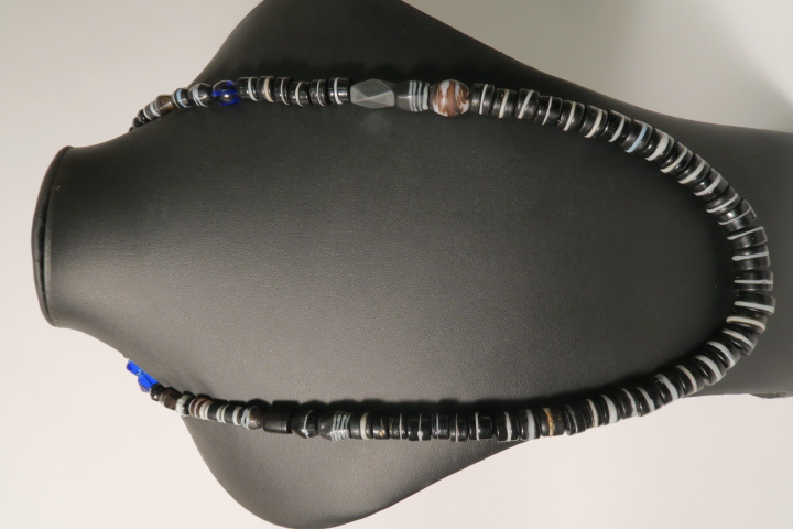 Strang alter Glasperlen aus dem Sahel, vermutlich in Indien und Böhmen gefertigt. Der Großteil der Perlen sollten Achatperlen imitieren. Geringe Farbabweichungen bedingt durch digitale Wiedergabe sind möglich. Stranglänge ca. 73cm. Durchmesser der Perlen ca. 9 - 15mm. Gewicht ca. 172gr.