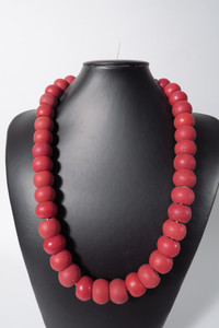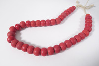 Strang alter großer Glasperlen, von Böhmen (Gablonz, Jablonec) um 1880 - 1920 nach Westafrika gehandelt. 35 Perlen, teils bestoßen mit Chips. Stranglänge ca. 55cm. Durchmesser der Perlen ca. 21mm. Gewicht ca. 385gr. Geringe Farbabweichungen sind bedingt durch digitale Wiedergabe möglich.