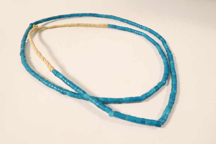 Strang alter Glasperlen aus Murano/Venedig, 1850-1930 nach Afrika gehandelt. Glasperlen mit weißem Innenkern in gutem altersgemäßem Zustand, teils bestoßen mit Chips. Länge des Strangs ca. 62cm.  Durchmesser der Perlen ca. 3mm. Gewicht ca. 16gr.