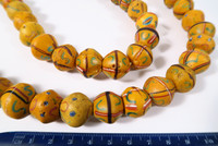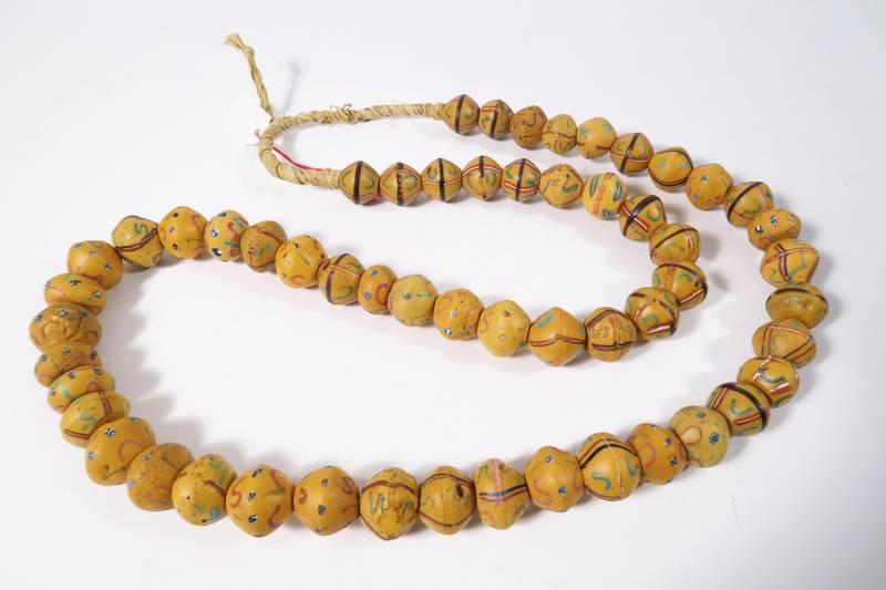 Alte Wickelglasperlen aus Murano, 56 Perlen in zumeist gutem altersgemäßem Zustand, teils bestoßen mit Chips. Gleiche Perlen sind auf alten Musterkarten von 1865 abgebildet. Länge des Strangs ca. 80cm.  Durchmesser der Perlen ca. 16-20mm. Gewicht ca. 450gr.