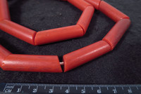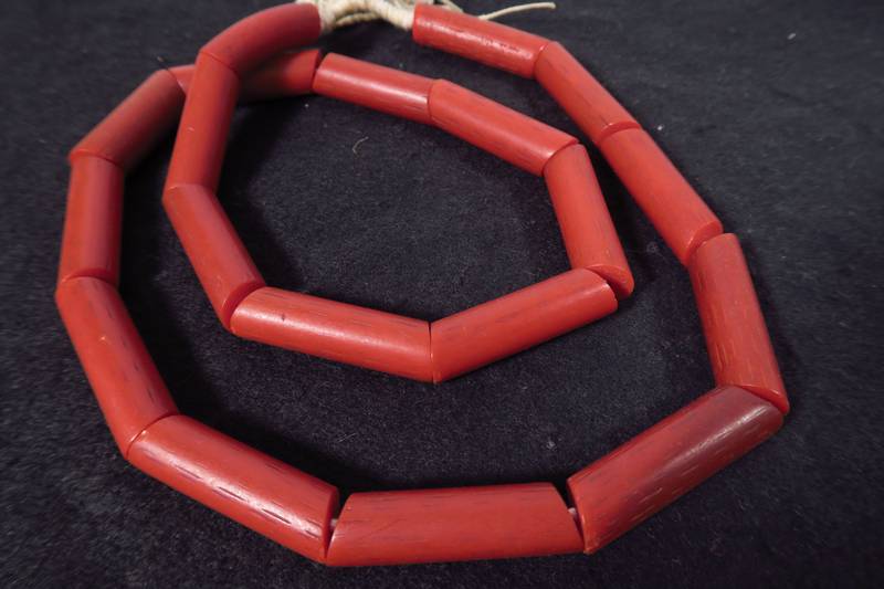 Schöner langer Strang von länglichen Kunststoffperlen, oft als Bakelit oder Vulcanic Beads bezeichnet. Zwischen 1920-1950 in Europa produziert und nach Afrika gehandelt. Diese Perlen sollten wohl rote Korallenperlen imitieren. Stranglänge nur Perlen ca. 70cm. Durchmesser ca. 11 - 13mm. Gewicht ca. 105gr.