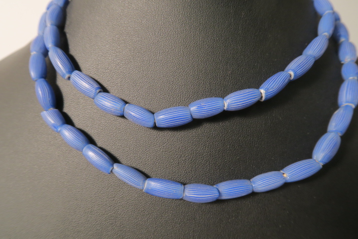 Strang alter Glasperlen vermutlich von Murano um 1880-1930 nach Westafrika gehandelt. Glasperlen in zumeist gutem Zustand, teils bestoßen mit Chips. Durchmesser der Perlen ca. 6 - 7mm. Stranglänge nur Perlen ca. 71cm. Gewicht ca. 55gr.