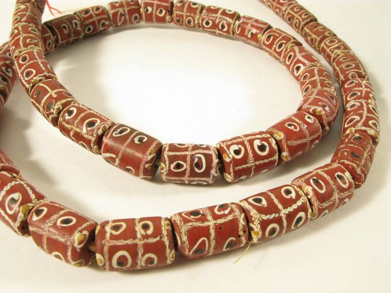 Strang von 45 Stück alten Handelsperlen, von Venedig um 1850-1880 nach Afrika gehandelt. Die Glasperlen sind in unterschiedlichem gutem altersgemäßem Zustand. Stranglänge nur Perlen ca. 72cm. Durchmesser der Perlen ca. 12 - 14mm. Gewicht ca. 210gr.