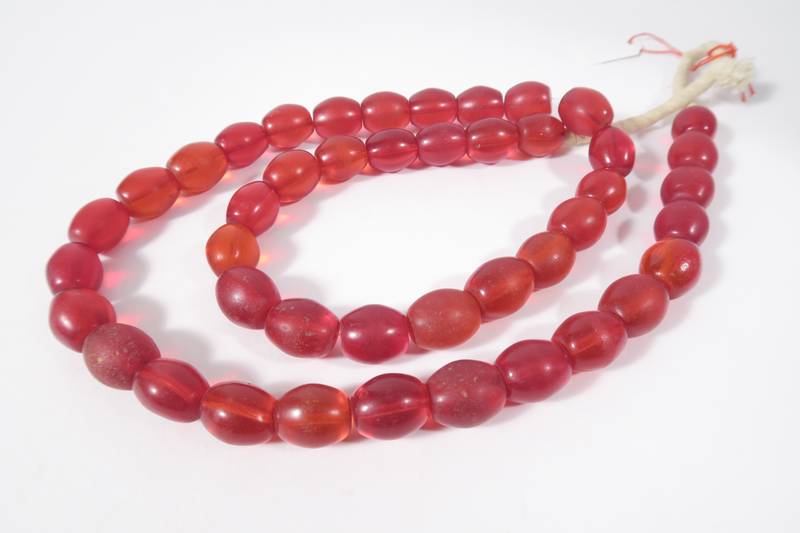 Strang alter Handelsperlen, von Böhmen (Gablonz, Jablonec) um 1920-1960 nach Westafrika gehandelt. 30 Glasperlen. Schöne unterschiedliche Rottöne. Stranglänge ca. 68cm. Durchmesser der Perlen ca. 13-14mm. Gewicht ca. 185gr. Geringe Farbabweichungen sind ,bedingt durch digitale Wiedergabe, möglich.