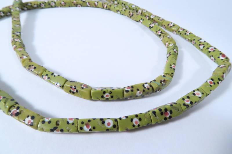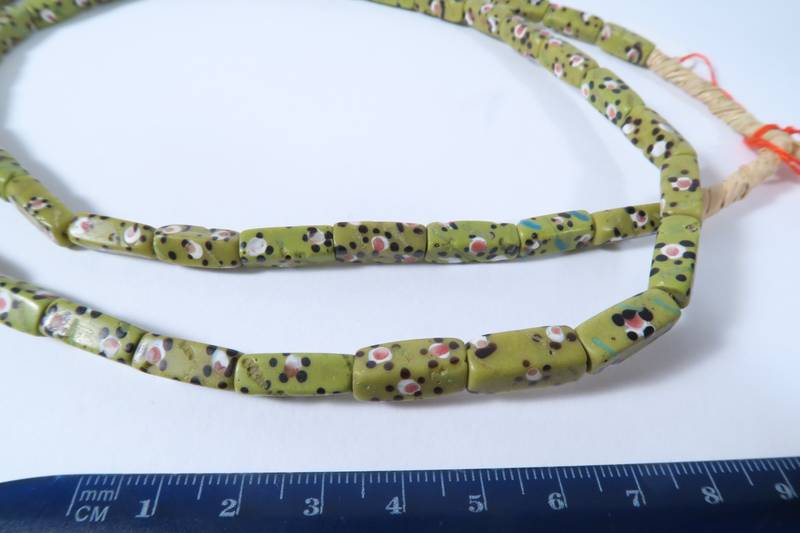 Alte viereckige Glasperlen, von Venedig um 1880-1930 nach Westafrika gehandelt. Guter Zustand, teils bestoßen mit Chips. Geringe Farbabweichungen sind bedingt durch digitale Wiedergabe möglich. Stranglänge ca. 80cm. Durchmesser der Perlen ca. 5 - 6mm. Gewicht ca. 70gr.