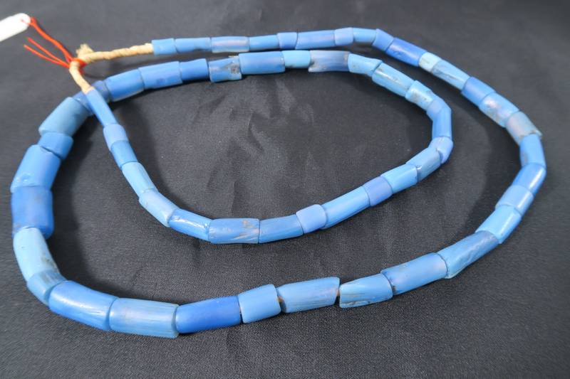 Strang alte Handelsperlen, vermutlich von Venedig um 1880-1930 nach Westafrika gehandelt, welche teils in Westafrika erneut erhitzt und verändert wurden. Die Perlen sind in zumeist gutem altersgemäßem Zustand, teils jedoch mit Chips. Stranglänge ca. 84cm. Durchmesser der Perlen ca. 7 - 11mm. Gewicht ca. 135gr. Geringe Farbabweichungen sind bedingt durch digitale Wiedergabe möglich.