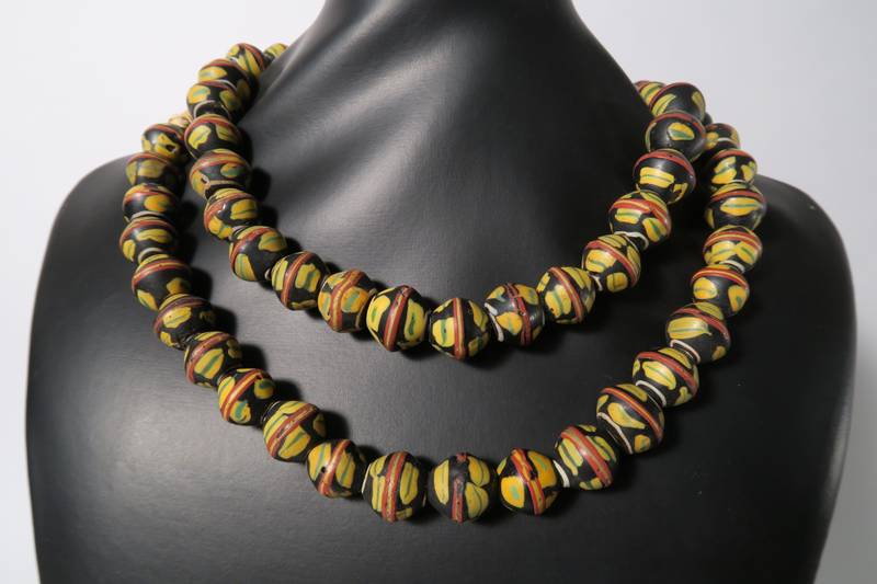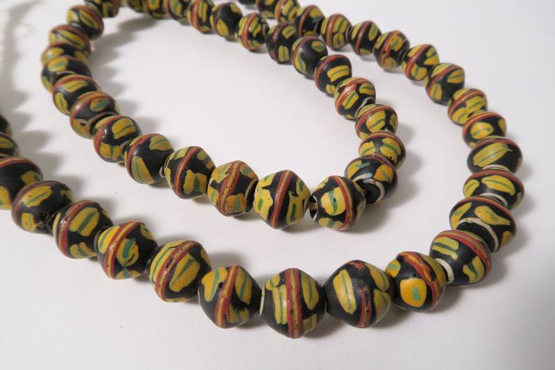 Antike Glasperlen von Murano nach Afrika gehandelt. Die King beads sind in zumeist gutem altersgemäßem Zustand, teils bestoßen mit Chips. Länge des Strangs (nur Perlen) ca. 84cm.  Durchmesser der Perlen ca. 15 - 16mm. Gewicht ca. 305gr.