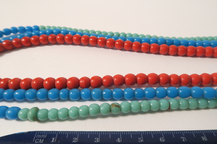 3 Stränge von Glasperlen, Prosser oder Bapterosse beads genannt, welche von Böhmen und Frankreich bis ca. 1960 nach Westafrika gehandelt wurden. Guter altersgemäßer Zustand, teils bestoßen mit Chips, lange getragen. Stranglänge ca. 56 - 72cm. Durchmesser der Perlen ca. 6 - 8mm. Gesamtgewicht ca. 130gr. Geringe Farbabweichungen sind bedingt durch digitale Wiedergabe möglich.