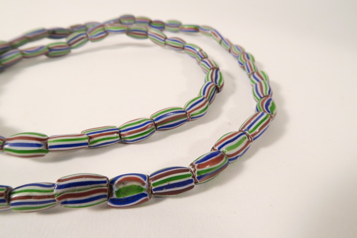 Strang alter Glasperlen vermutlich von Murano um 1880-1930 nach Westafrika gehandelt. Glasperlen in zumeist gutem Zustand, teils bestoßen mit Chips. Durchmesser der Perlen ca. 4 - 9mm. Stranglänge nur Perlen ca. 67cm. Gewicht ca. 52gr.