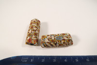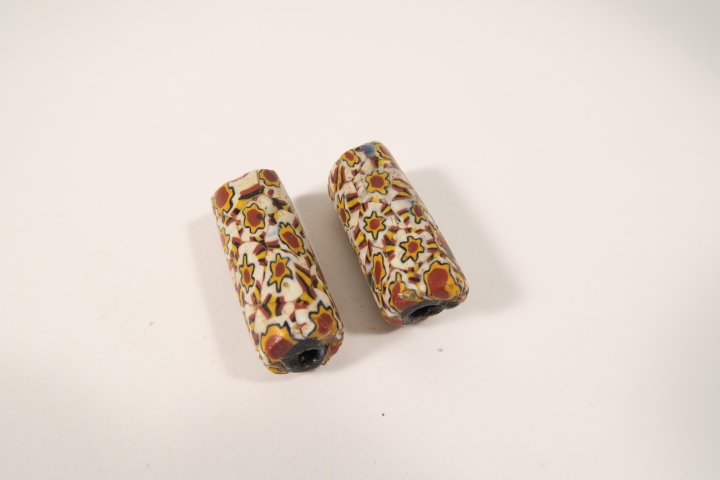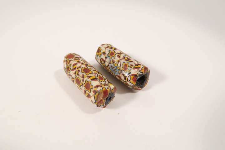 2 Millefiori Glasperlen, Murano vor 1930, aus dem Afrikahandel. Altersgemäßer Zustand, bestoßen mit Chips. Dimension ca. 32 x 13mm.