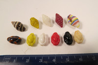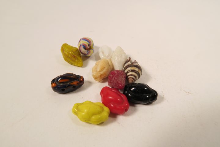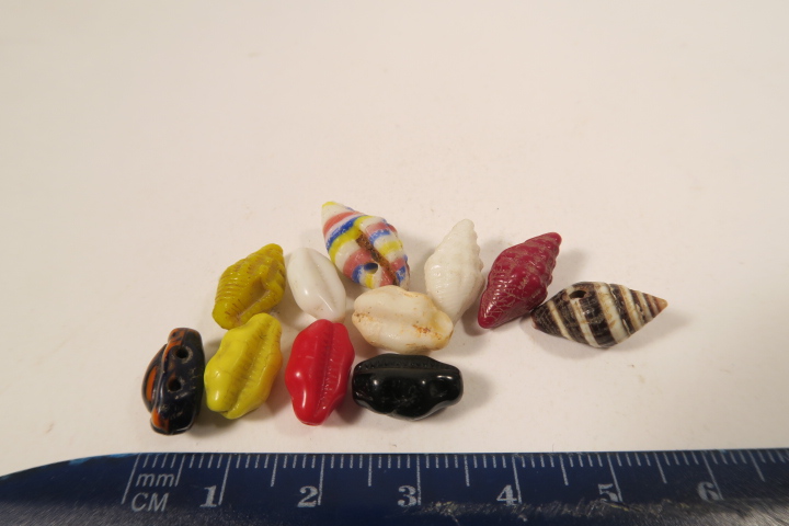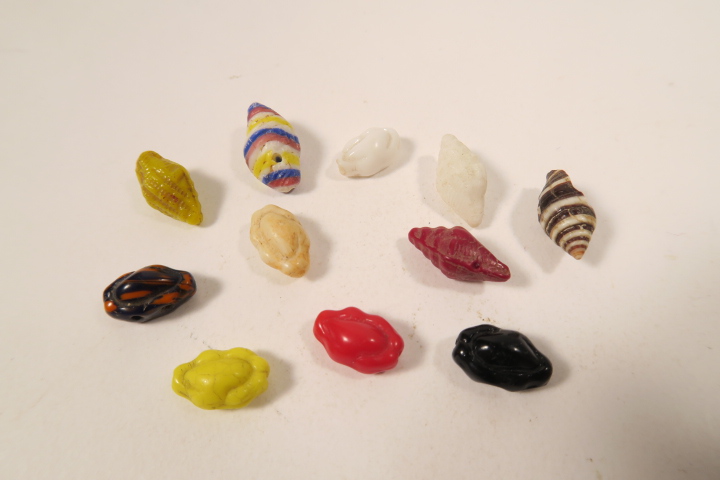10 alte böhmische Glasperlen in Schneckenform sowie eine Täubchenschnecke aus dem Afrikahandel.