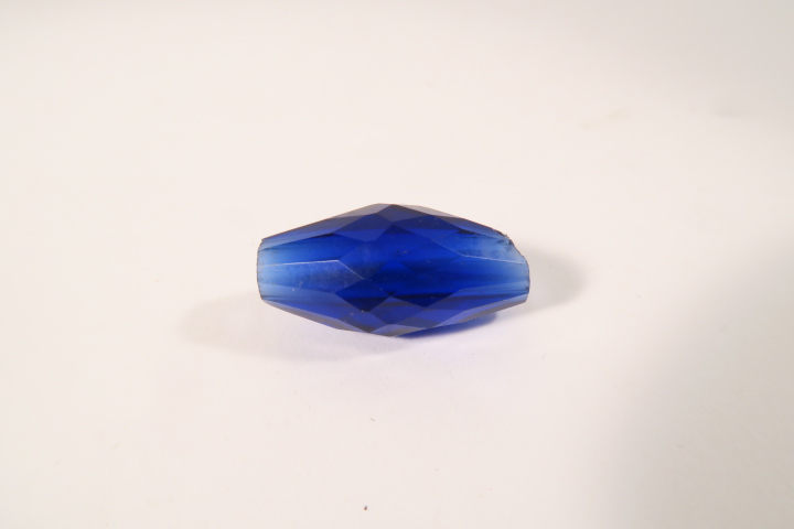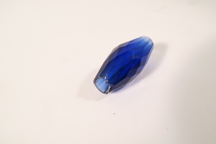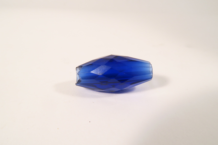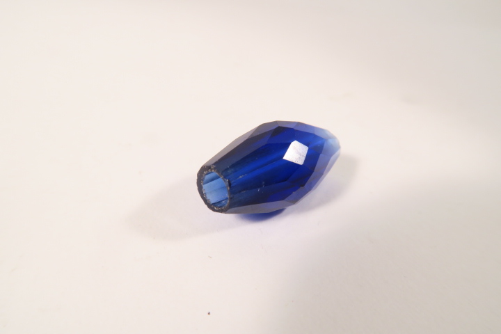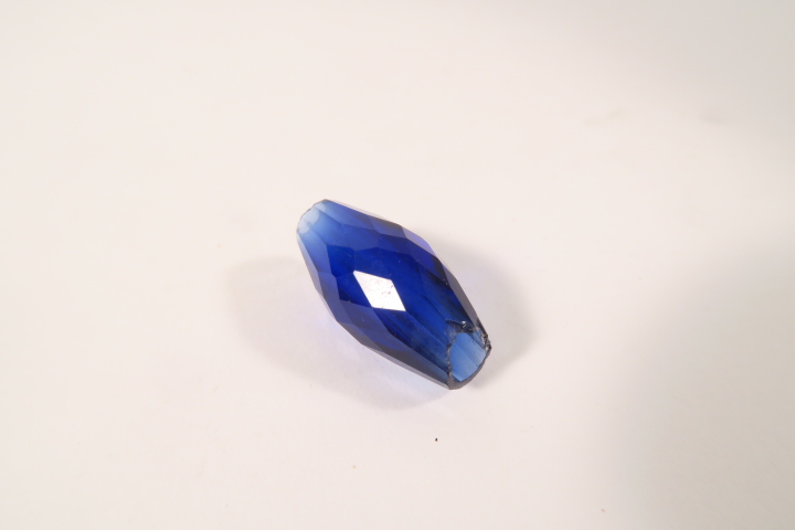Alte Glasperle, Böhmen ca. 1800-1900. facettierte Glasperle, Länge ca. 31mm, Durchmesser bis ca. 15mm. Chip an einem Rand, ansonsten guter altersgemäßer Zustand, siehe Fotos.