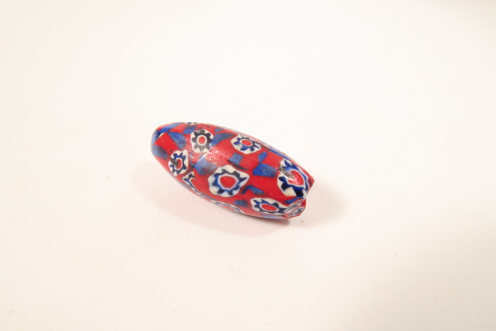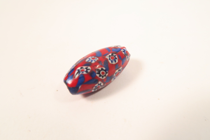 alte venezianische Millefiori Glasperle aus dem Afrikahandel. Größe ca. 29 x 13mm. Altersgemäßer Zustand, mit Chips, siehe Fotos.