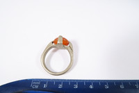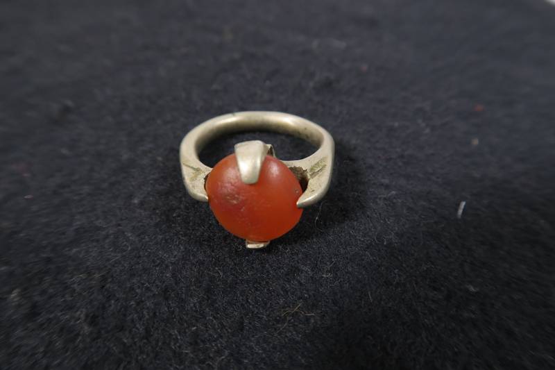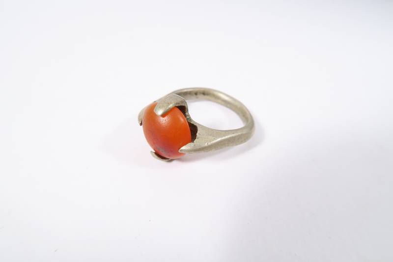 Alter und getragener Ring mit eingesetztem Karneol aus dem Niger. Weißmetall. Ringinnendurchmesser ca. 19mm. Durchmesser des Karneols ca. 12mm. Gewicht ca. 6gr.