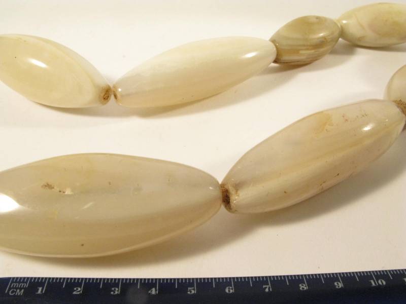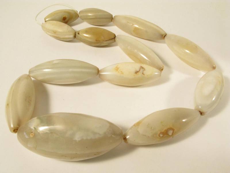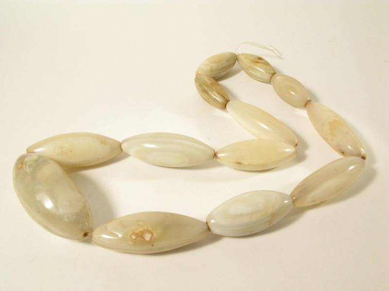 Strang alter und sehr großer Achatperlen vermutlich vormals in Cambay / Indien produziert und vor einigen Jahrzehnten nach Westafrika gehandelt. 13 Perlen, teils mit Chips. Perlenlänge von ca. 50mm - 93mm. Durchmesser der Perlen ca. 24 - 40mm. Länge (Umfang des Stranges) ca. 80cm. Gewicht ca. 995gr.