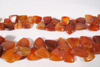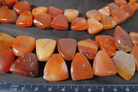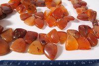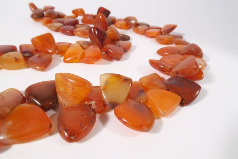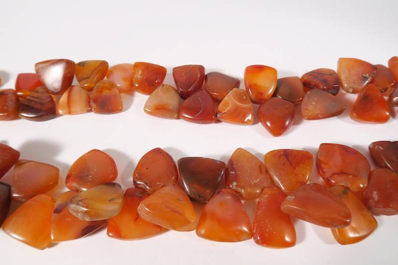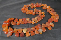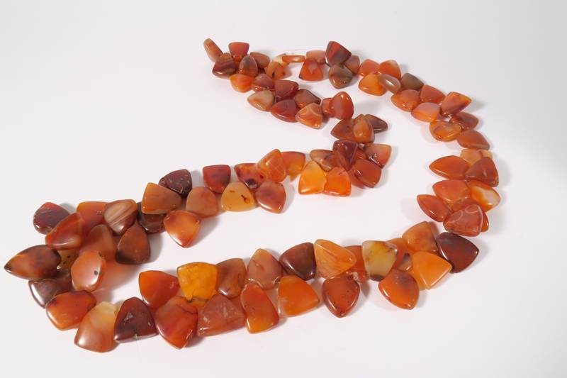 Strang alter flacher Achatanhänger bereits vor vielen Jahrzehnten vermutlich von Indien nach Westafrika gehandelt. Die Perlen sind in altersgemäßem Zustand, teils bestoßen mit Chips. Länge der Anhänger ca. 16 - 24mm. Stranglänge nur Perlen ca. 90cm. Gewicht ca. 500gr.